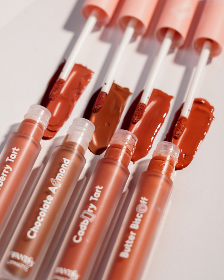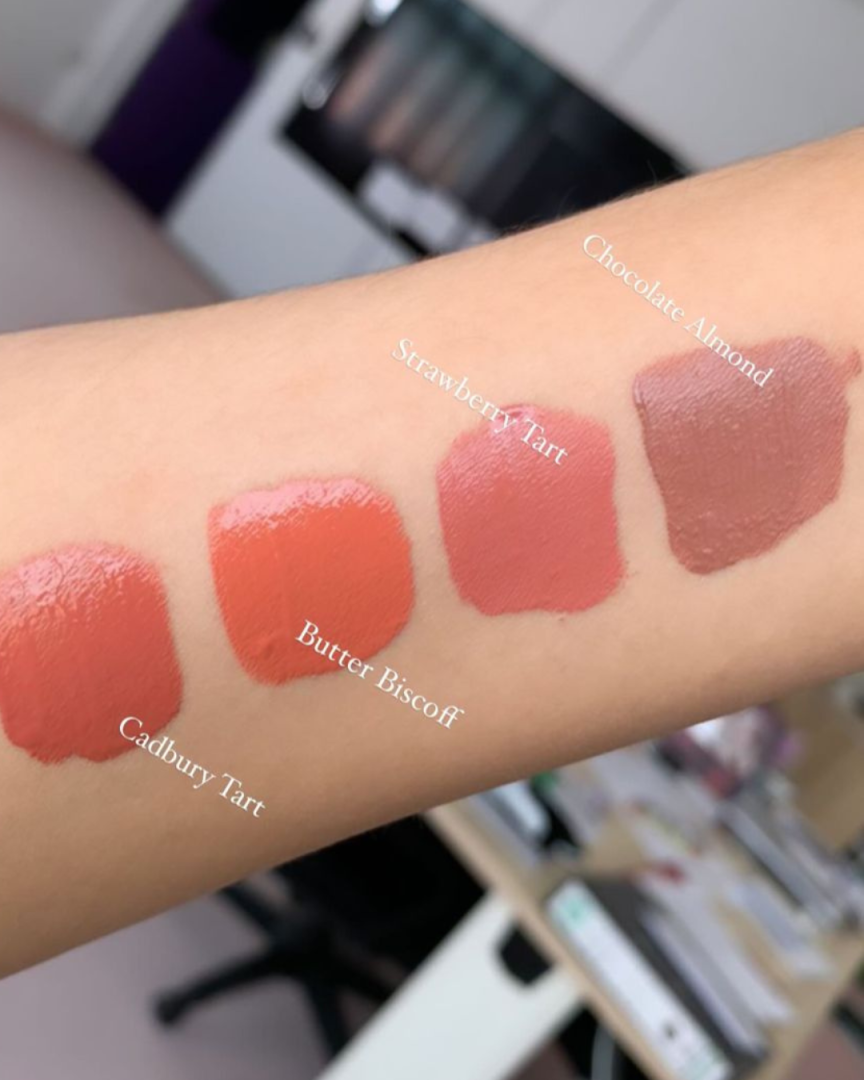 A curated range of luscious shades designed to flatter every smile. Chocolate Almond is a rich deep brown suitable for all skin tones, Strawberry Tart is a soft pink blush ideal for light to medium skin tones, Cdbury Tart is a warm brown-red that complements all skin tones, and Butter Biscoff is a vibrant orange-coral perfect for light to medium skin tones.